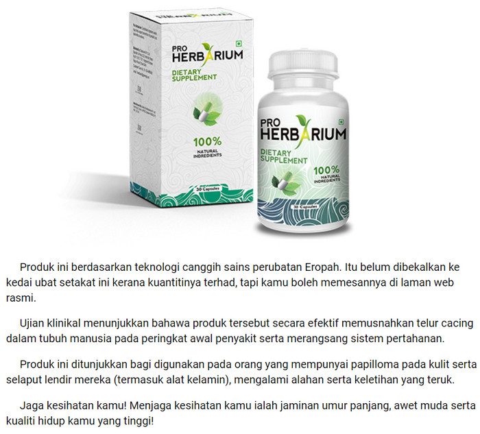 Pro Herbarium adalah ubat yang boleh membebaskan tubuh dari cacing. Ramai pengguna dan doktor yang menangani masalah jangkitan cacing telah berjaya berkenalan dengan Pro Herbarium. Keberkesanan produk ditunjukkan oleh sijil kualiti yang ada. Produk telah melewati sejumlah pemeriksaan yang diperlukan dan wajar, bahaya komposisinya telah disahkan sepenuhnya. Di samping itu, keberkesanan ProHerbarium disahkan oleh ulasan, pendapat dan testimoni pengguna pengguna di forum.